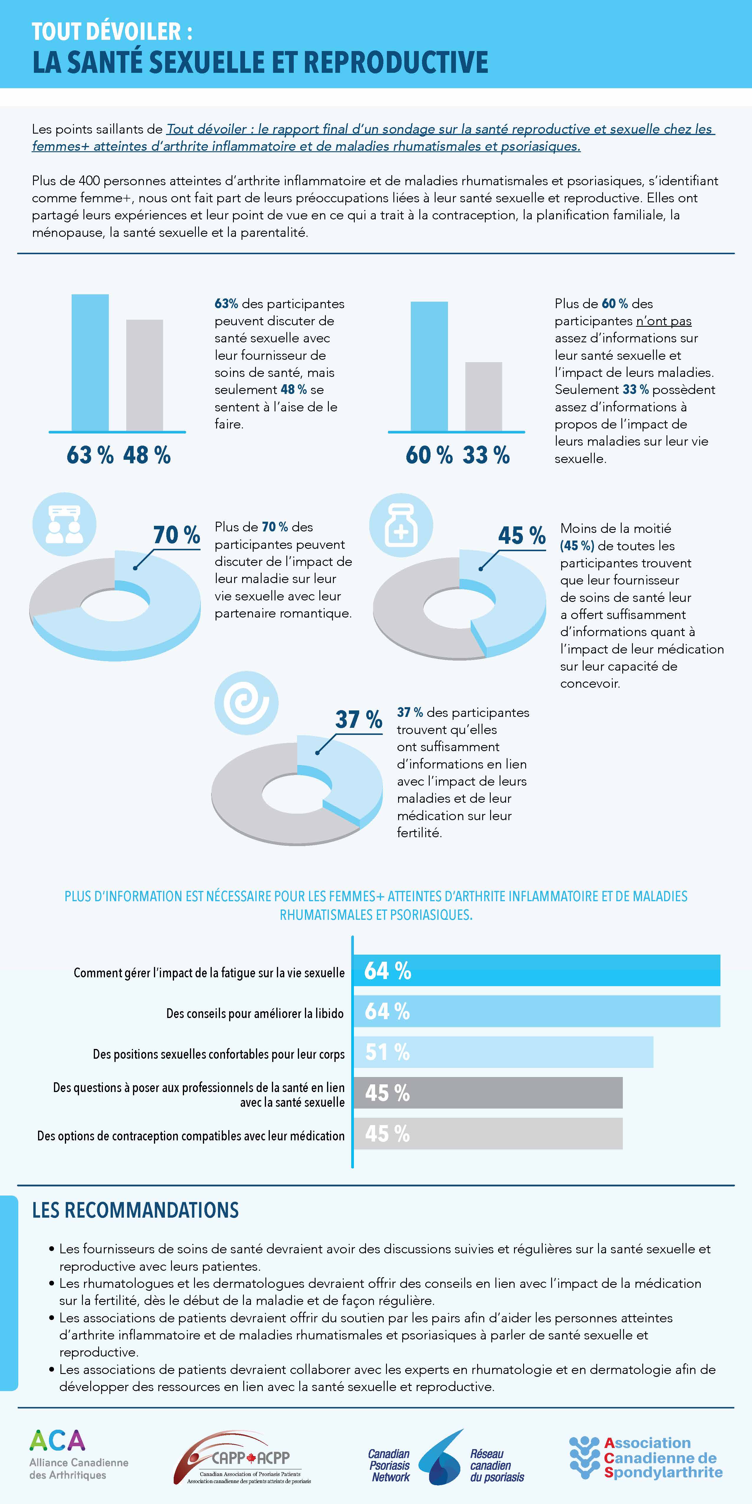 Report title FRENCHBaring it all (Tout dévoiler) : Rapport final d’une enquête sur la santé reproductive et sexuelle des femmes+ atteintes d’arthrite inflammatoire, de psoriasis et de maladies rhumatismales.